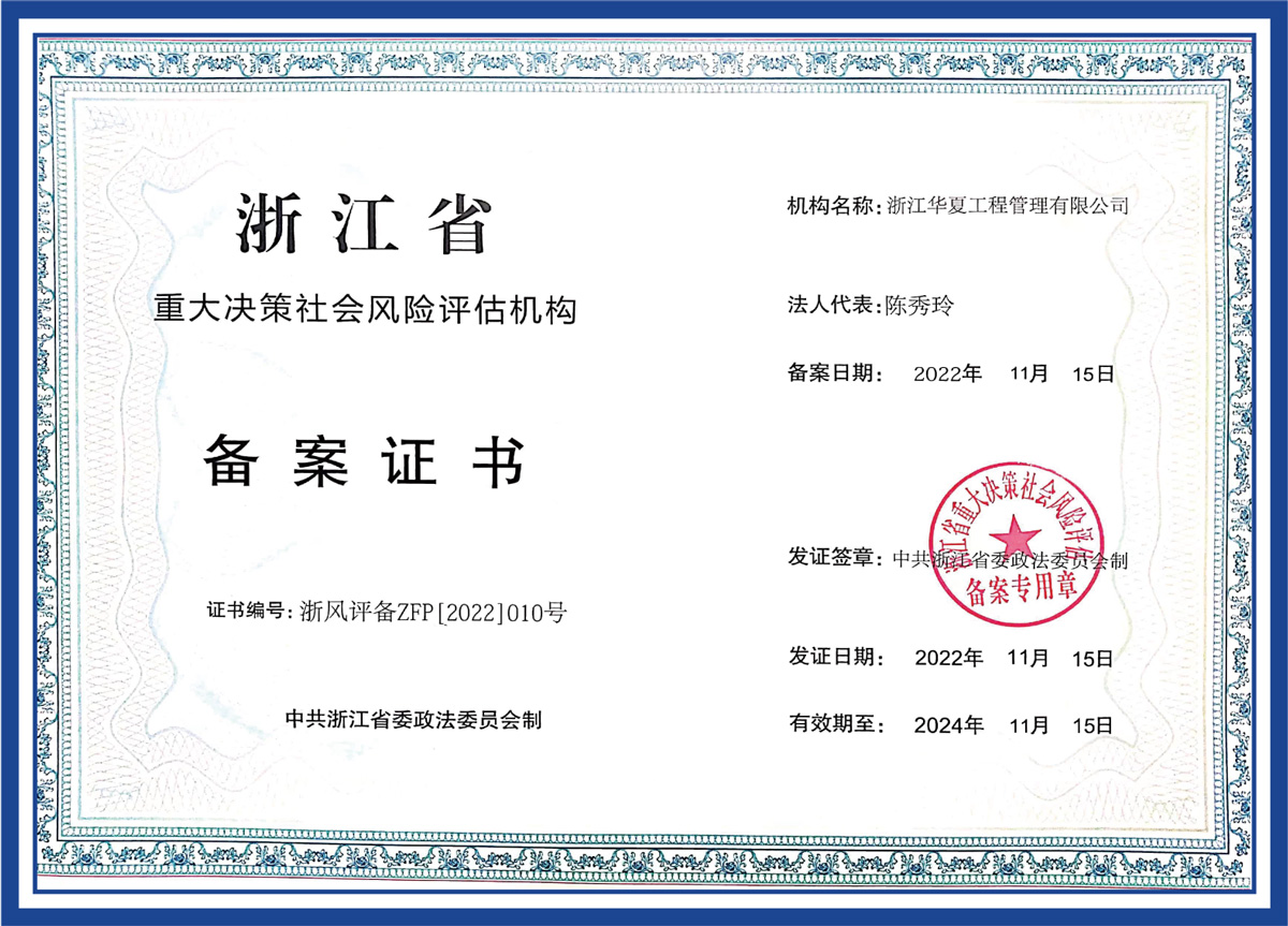 浙江省重大決策社會(huì)風(fēng)險(xiǎn)評(píng)估機(jī)構(gòu)備案證書(shū)