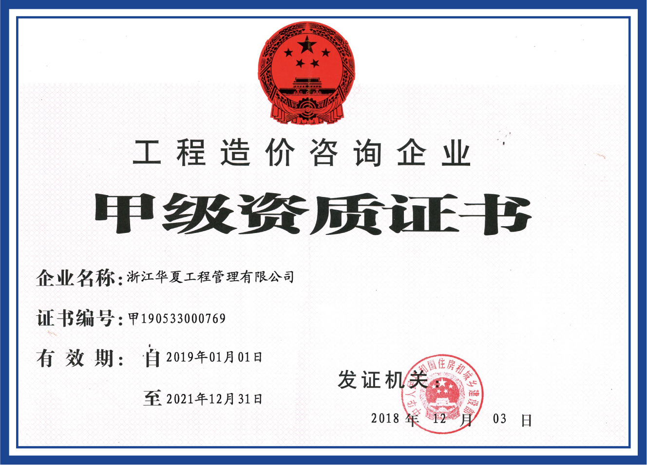 工程造價(jià)咨詢企業(yè)甲級(jí)資質(zhì)證書(shū)